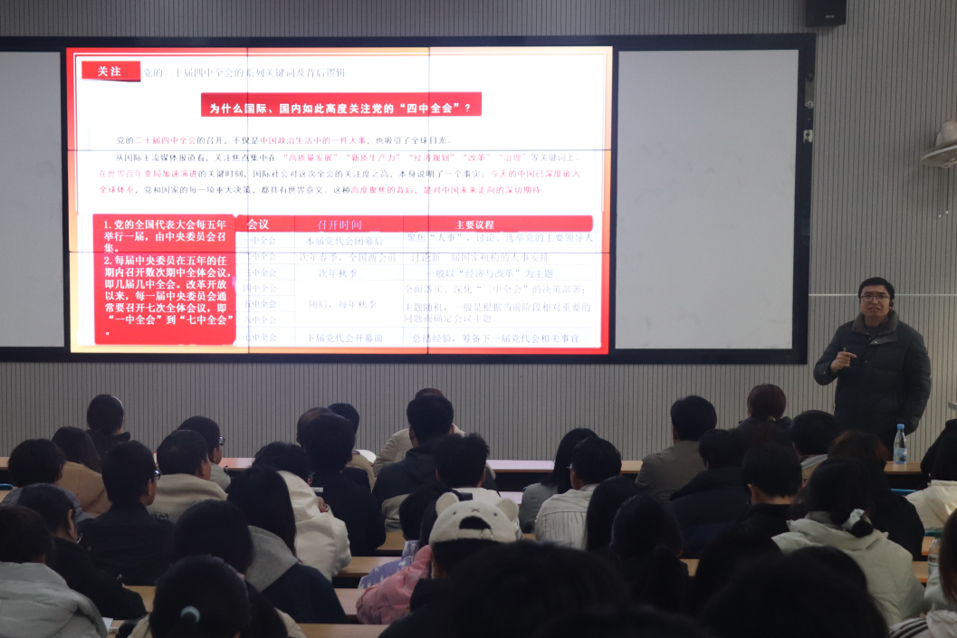 宣讲会上,朱海涛老师以“深刻把握党的二十届四中全会精神,谱写中国式现代化新篇章”为主题展开宣讲,从全会召开的时代背景、核心议题、重大部署三个维度,结合学院办学特色与工科专业发展趋势,深入解读全会提出的关于科技创新、制造业升级、人才培养等方面的重要要求,强调要主动对接国家需求,推动产学研深度融合,为现代化建设强化人才支撑与技术动能。
