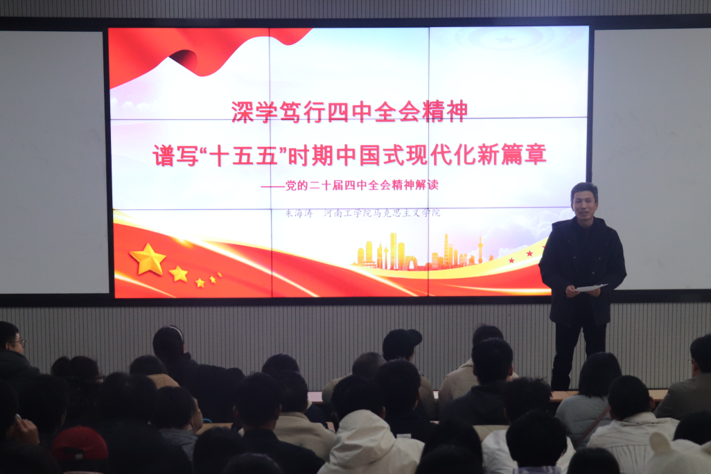 为深入学习贯彻党的二十届四中全会精神,引导师生准确把握全会核心要义和实践要求,智能工程学院于12月24日下午邀请到河南工学院党的二十届四中全会精神宣讲团成员朱海涛老师开展党的二十届四中全会精神专题宣讲活动。学院师生代表齐聚现场,共同学习领会全会精神的丰富内涵与时代意义。