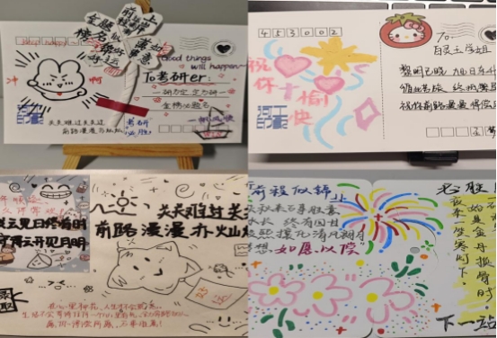 为切实关注考研学子的心理健康状态,帮助大家调节心理压力,增强心理韧性和抗压能力,强化不同年级学生之间的情感联结,12月14日——12月18日,李佩珊辅导员工作室组织开展“研途与你,祝福予你”——贺卡送祝福活动。