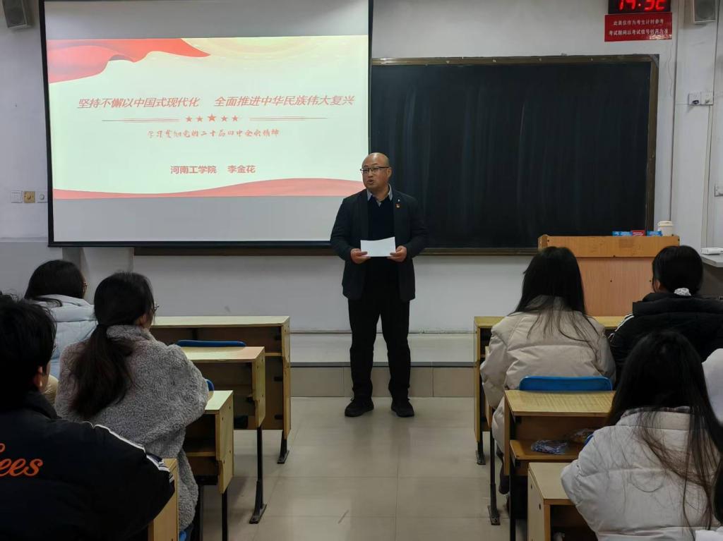 12月30日上午,河南工学院经济学院邀请我校党的二十届四中全会精神宣讲团成员李金花,在教二B206教室举办了一场主题鲜明、内容深刻的学习宣讲会,以“坚持不懈以中国式现代化全面推进中华民族伟大复兴”为主题,学习贯彻党的二十届四中全会精神。经济学院预备党员、入党积极分子、各班级团支书、青马班及学生会干部参加会议,共同领悟全会精神,明确时代方位,凝聚青春力量,宣讲学习活动由经济学院党委书记尚林鹏主持。
