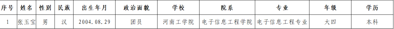 根据《中共河南省委教育工委办公室 河南省教育厅协公室关于开展全国“最美高校辅导员”“最美大学生”遴选推荐有关工作的通知》(教思政函[2026]70号)要求,经学生自主申请、学院推荐、学生处审核和专家评审,确定参评“最美大学生”拟推荐人选,公示名单如下: