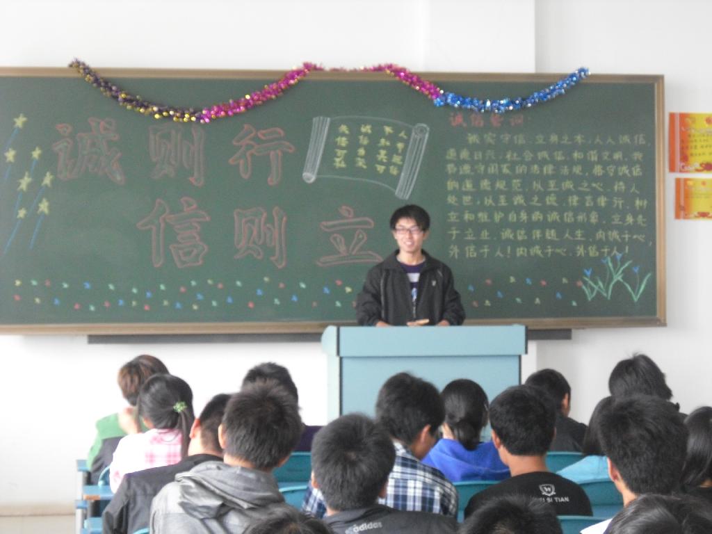 首先各班积极响应召开主题班会,班委和学生代表积极踊跃的发言将班会推向高潮,使诚信的观念更加的深入人心。