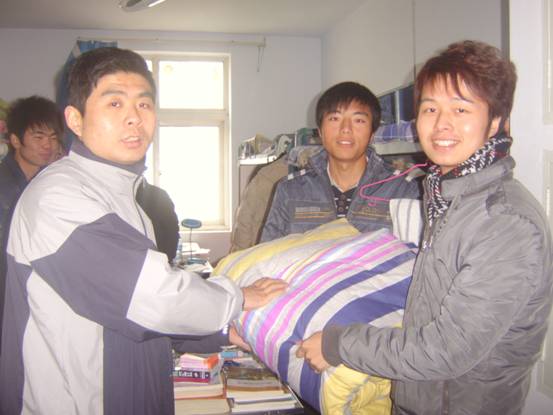 马磊老师和邢海风老师为学生送上“爱心”棉被