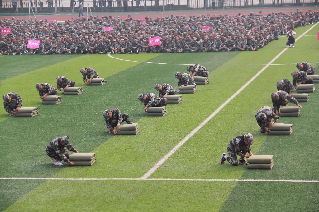大会在庄严的国歌声中拉开了帷幕。在激昂的检阅进行曲中,2015级新生开始了分列式表演。他们个个精神抖擞,军姿挺拔,迈着矫健的步伐通过主席台,接受与会领导和部队首长的检阅。接着,新生还进行了军体拳表演(男、女各一个方队)、内务整理表演,战场救护表演和拉歌比赛。从汇报表演开始到结束,整个训练场气势恢宏。随着教官短促有力的口令,新生们迅速、整齐地完成一个个规定动作。整齐的方队,饱满的精神,准确的口令、嘹亮的声音搏得了在场领导和观众热烈的掌声。
