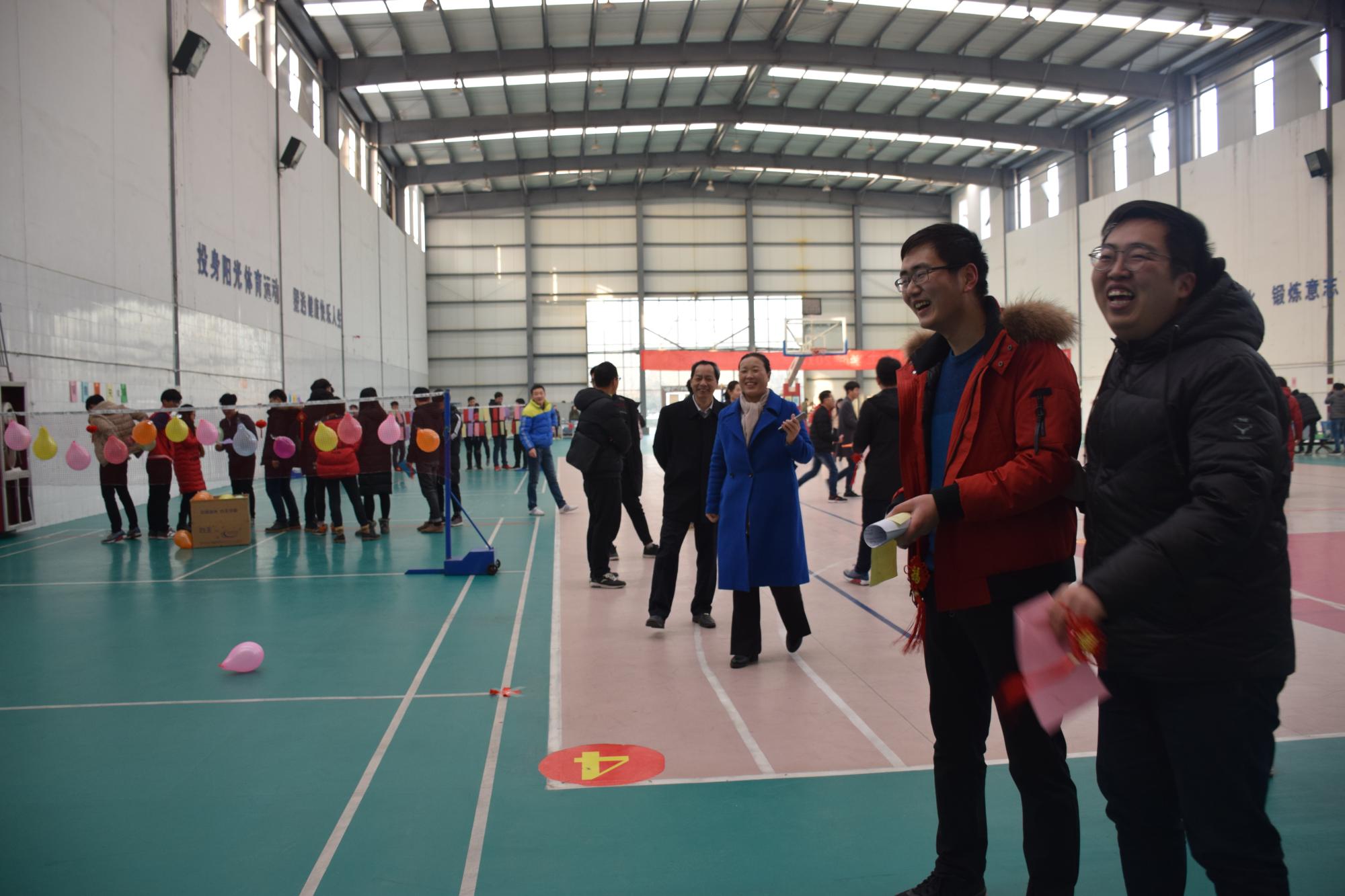 本次游园活动共设盲人击鼓、筷子夹乒乓球、猜谜语、抛福球等8个项目,游戏集聚了趣味性、娱乐性、互动性,吸引了广大师生参与其中,活动现场气氛热烈,笑声四溢。有的戴上眼罩小心翼翼地向大鼓走去,有的集中精力持筷夹乒乓球,有的在谜语前面驻足思考,有的奋力向搭档抛出去福球……球类馆里一片热闹景象,大家在喜庆、热闹的活动中共同迎接新年的到来。