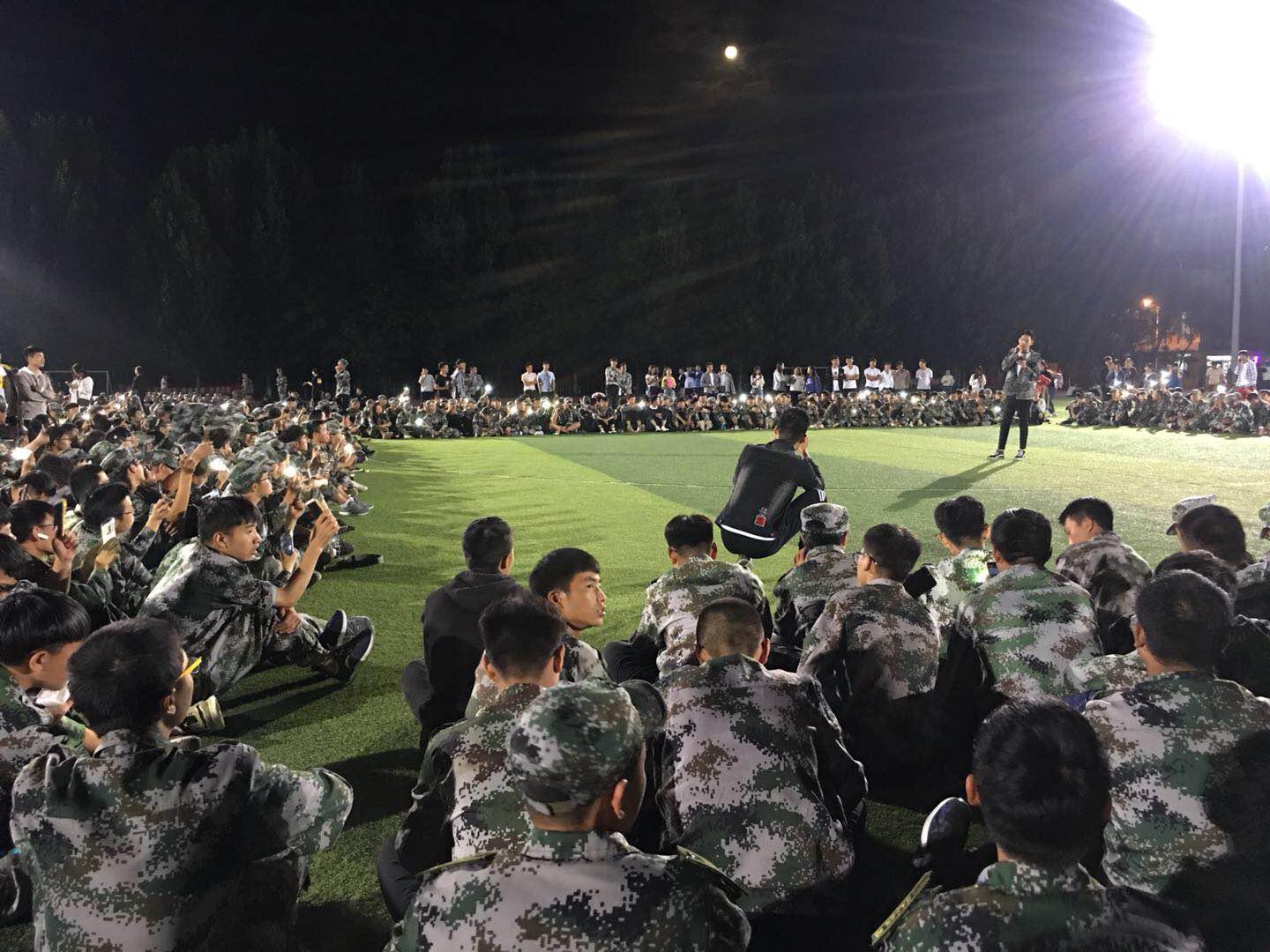 头顶是十五的一轮圆月,远处是新生茶话会的灯火通明,夜幕中回荡着的笑声与歌声,使这个和军训“撞车”的中秋佳节,多了一份温暖和感动。