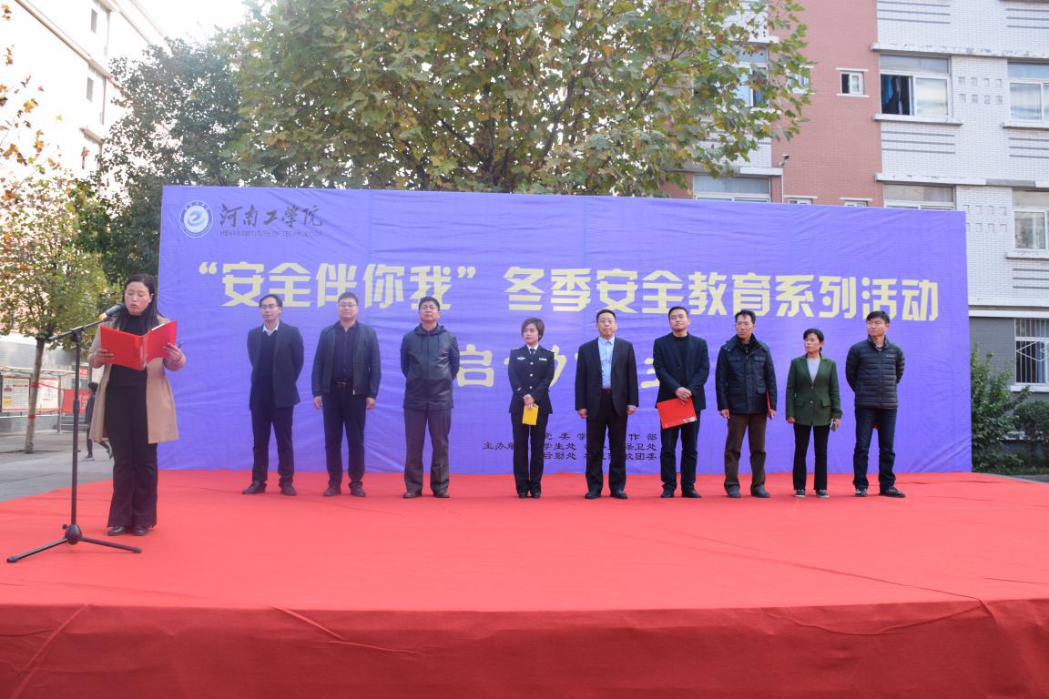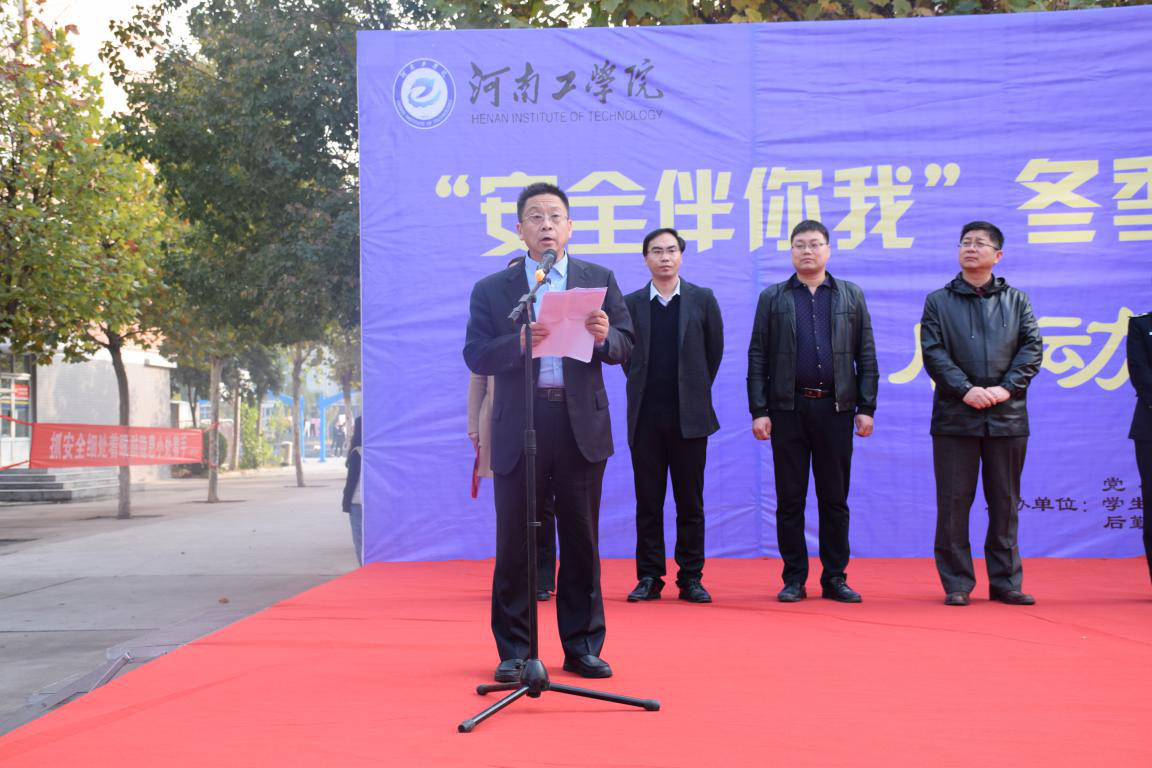 副院长张国臣在启动仪式上致辞,他指出安全工作是学校工作的生命线,全体师生必须了解当前的安全形势,明确做好安全工作的意义、责任和要求,同时就进一步做好校园安全工作提出四点要求:一、进一步提高认识,全面做好校园安全稳定工作。要充分认清当前校园安全稳定工作所面临的严峻形势,进一步增强政治意识、责任意识、忧患意识,把校园安全稳定工作当做一项重要的政治任务,把冬季安全教育管理为当前学校各项工作的重中之重;二、进一步开展排查,扎实整改各类校园安全隐患。要建立健全安全隐患排查整改工作长效机制,将安全隐患的排查整改常态化、规范化,同时要在敏感时期和特殊节点,有针对性地开展专项排查、整治;三、进一步加强教育,切实提高师生安全防范意识。针对冬季风干物燥、易发事故的季节特点,对学生进行用电、取暖、防火、出行等各类安全教育,不断增强学生的安全防范意识和自我保护能力;四、进一步强化措施,有效做好学生管理工作。严格执行日常管理“五查制度”、学生工作人员值班工作制度,做好安全稳定群体性突发事件的预防工作,及时发现和消除各类学生管理工作中的安全隐患。随后后勤处负责人任之超、保卫处负责人何伟分别宣读了《河南工学院2018年“安全伴你我”冬季安全教育系列活动实施方案》、《河南工学院2018年消防安全宣传教育实施方案》。