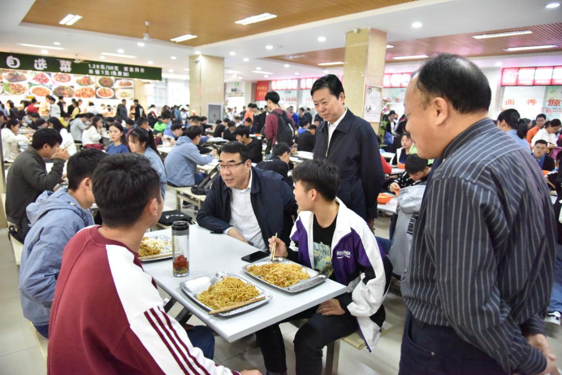 在调研中,赵学通、陈丙义向餐厅负责人详细询问了就餐人数、窗口数量和菜品种类等基本情况,仔细察看了餐厅主食库、副食库、毛菜间和食品留样柜,认真检查了食品原料供货记录和保质期,详细了解了食品原料来源、价格以及质量控制各环节,并与就餐学生详细交谈,询问了学生对餐厅饭菜质量、价格以及服务态度等方面的看法,认真听取就餐学生对学校餐厅工作的意见和建议。赵学通充分肯定了学生餐厅在管理服务工作中所取得的成绩,并就进一步做好学校的饮食工作提出了要求,他强调,师生饮食工作事关全校师生的切身利益、事关学校安全稳定,相关部门和负责人要切实提高政治站位和思想认识,高度关注食品卫生安全,杜绝食品安全隐患,努力提高饭菜质量,让师生吃上放心的可口的食品,勉励学生要珍惜韶华、不负青春,坚守本分、回归常识,自我加压,刻苦学习,把更多时间花在读书上,把更多精力放在实践上,把学习作为一种责任、一种精神追求、一种生活方式,努力学习知识、历练品质、提升能力,提高内在素质,锤炼过硬本领。陈丙义要求学校相关部门不断改进并加强对饮食工作的管理和监督,加强与师生的交流与沟通,对师生反映的问题,要及时研究并予以答复,努力为师生营造和谐、舒适的就餐环境。