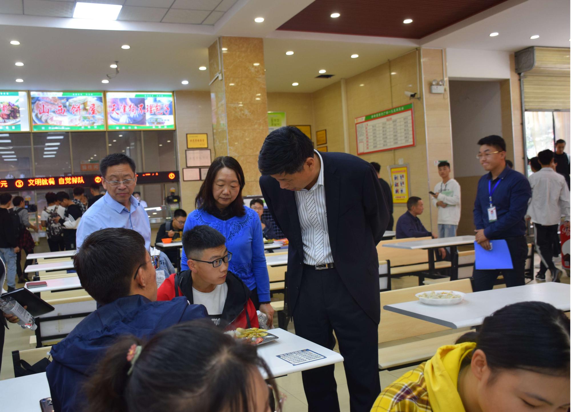 河南工学院坚持把调查研究贯穿“不忘初心、牢记使命”主题教育始终,切实解决师生关心关注的热点难点问题,打通为师生服务的“最后一公里”。10月12日中午,校党委书记赵学通、校长陈丙义等全体校领导深入学生餐厅调研,实地察看餐厅的服务保障工作和就餐情况,并与学生共进午餐,亲切交谈,了解学生们的学习、生活情况。党委办公室、党委学生工作部、校长办公室、后勤管理处等有关部门负责人参与调研。