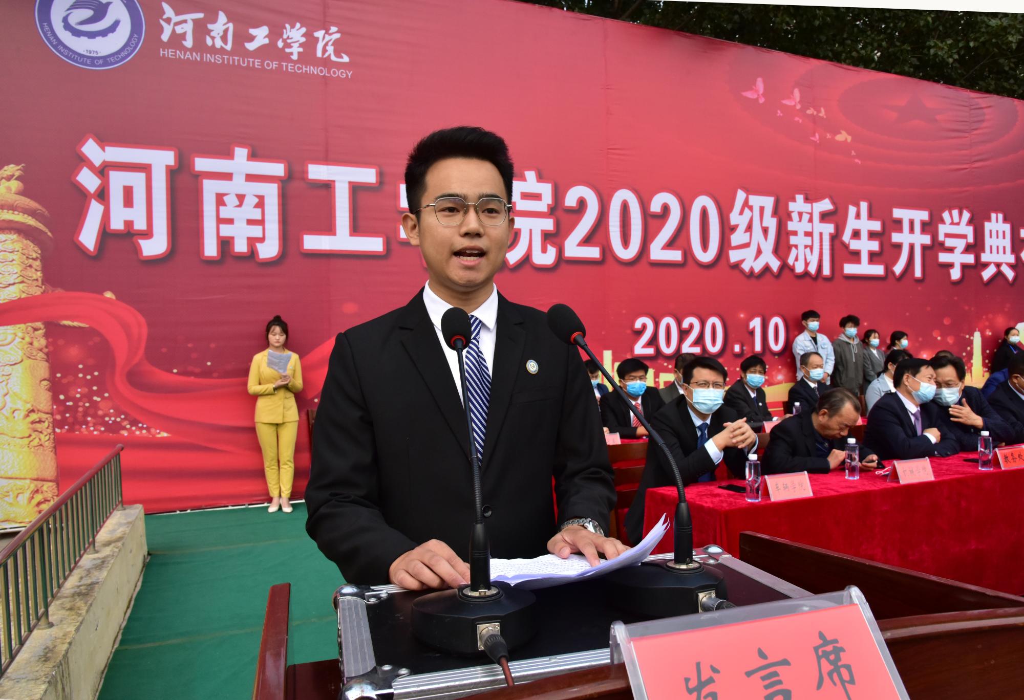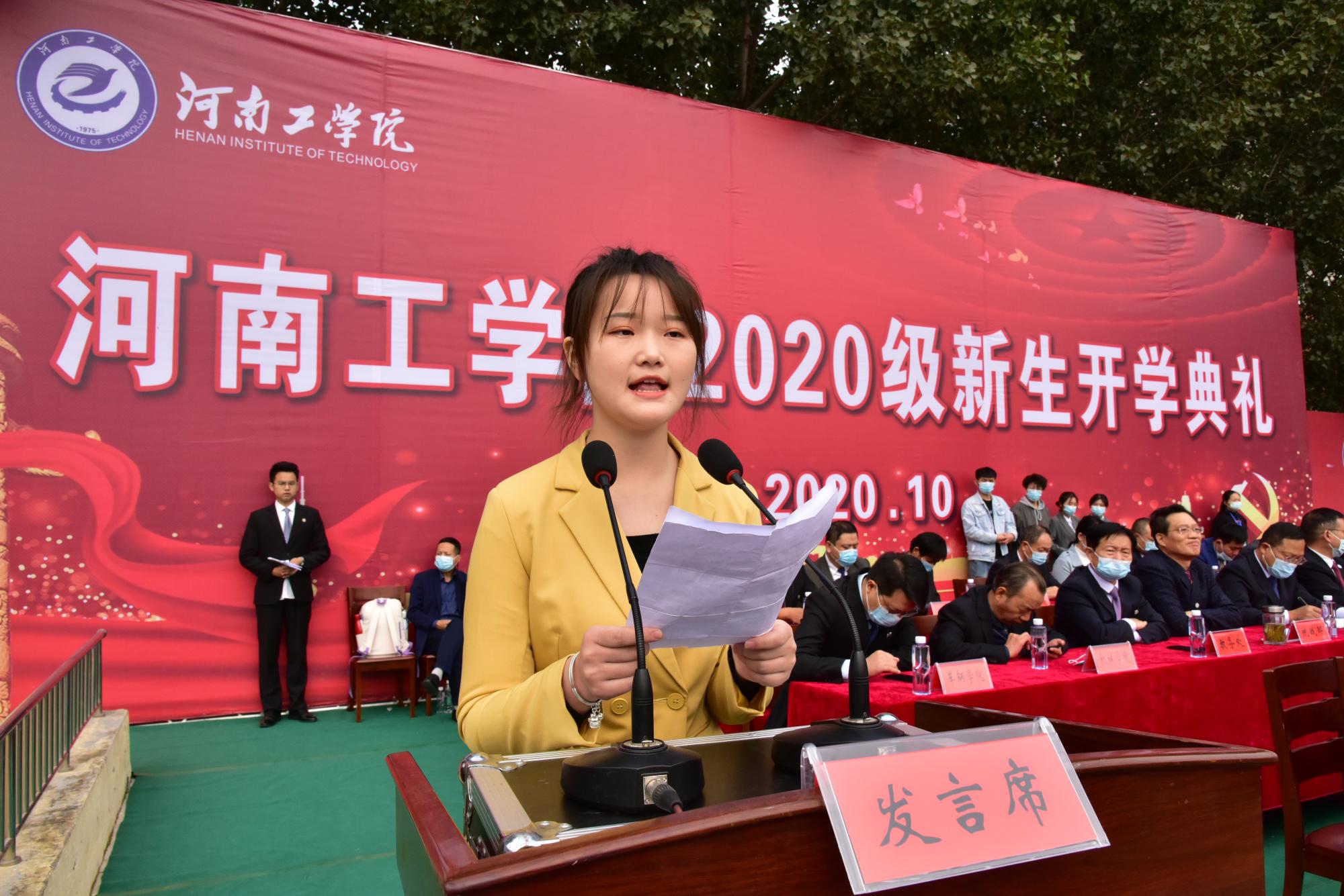 新生代表经济学院王楠同学发言,她带全体新生庄严承诺,坚定理想、志存高远、脚踏实地,在河南工学院这片沃土上开启新的征程。