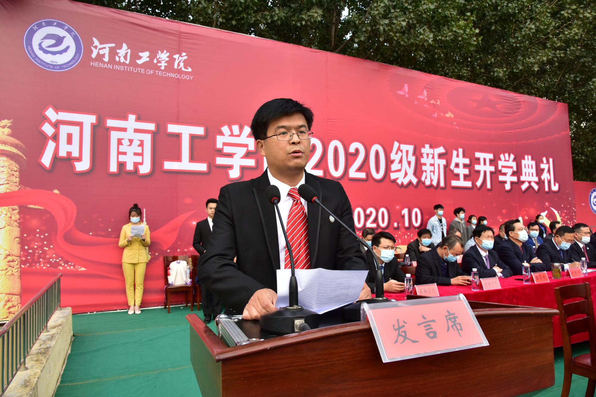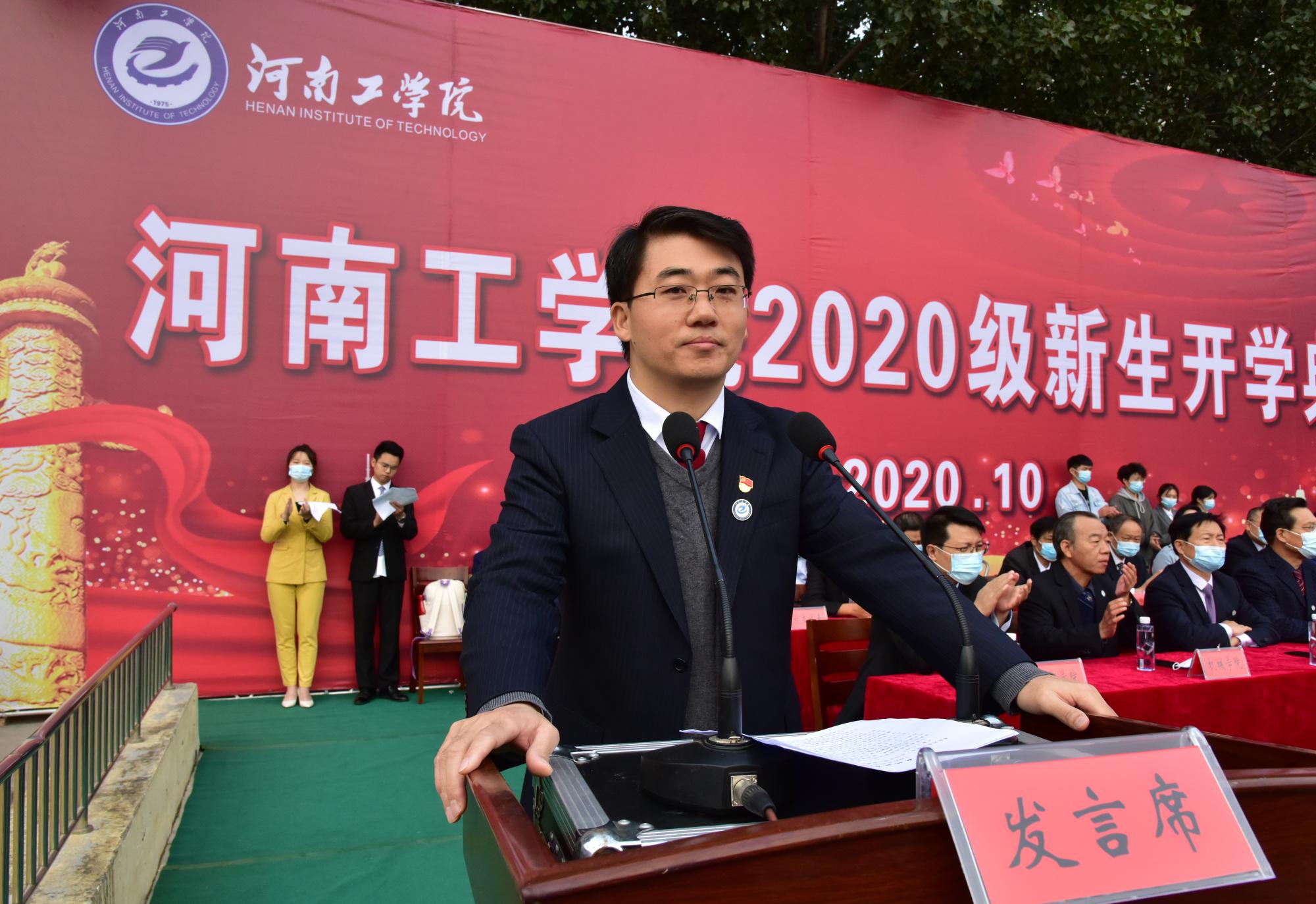 校长陈丙义发表了题为《珍惜韶华,拼搏奋进,在河工成就最好的自己》讲话。首先,他代表学校党委、校行政和全体师生员工向2020级新同学表示最热烈的欢迎,祝贺大家踏上人生新的起点。陈校长简要介绍了学校的基本情况、办学特色和办学成果,教育引导广大新生更好地感悟学校精神,更好地融入河南工学院大家庭。陈校长指出,河南工学院有着深厚的历史底蕴和辉煌的办学成果,经过几代人的艰苦创业,已经发展成为中原地区一所特色鲜明、优势突出的高等学府。历代河工人秉承“开拓进取、自强不息”的学校精神,严守“厚德精技、求实创新”的校训,涵养了“团结、创造、竞争、快乐”的淳厚校风、“修德爱生、敬业善育”的优良教风和“勤学善思、知行合一”的浓郁学风,形成了独具特色的河工精神和大学文化。