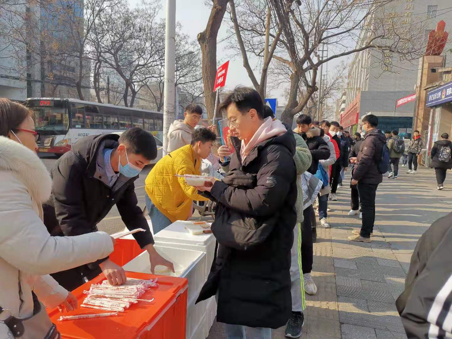 为做好考研学子一站式暖心服务,学校特制定考研学生赴考接送工作方案,召开专题协调会,提前安排部署了19辆客车专程接送788名考研学生赴12个考点。在学校餐厅为学生提前准备好热腾腾的午餐,由送考老师带至各考点,节省学生往返就餐时间,同时也确保了就餐的安全。并结合疫情防控相关规定,为考研学生准备了数量充足的口罩、消毒液等物资,配备了校医务人员组织防疫车辆专门护送发烧考生,各学院教师志愿者组成应急车队,应对考前的一些突发状况,为考研学子保驾护航。