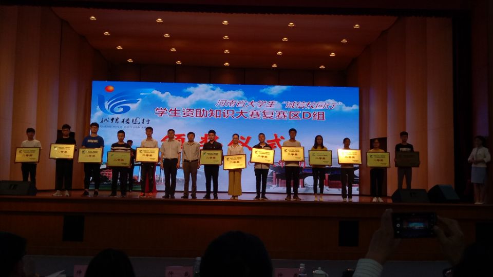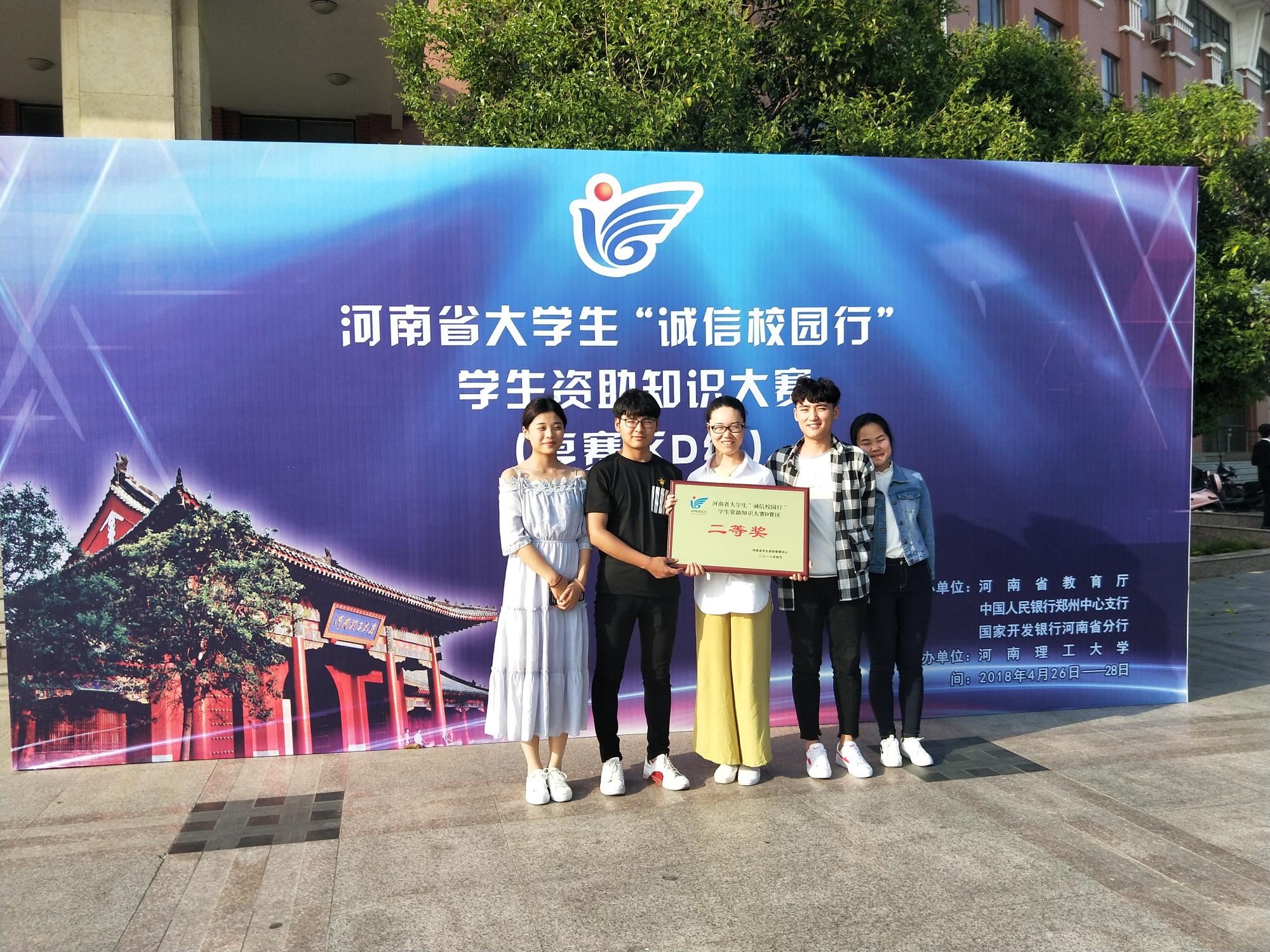 2018年4月27-28日,由河南省教育厅,中国人民银行郑州中心支行,中国银行业监督管理委员会河南监管局,国家开发银行河南省分行联合举办的“诚信校园行”学生资助知识大赛D赛区的赛事在焦作市河南理工大学新校区展开。我校代表队与来自省内包括河南理工大学、郑州师范学院、河南警察学院在内的19支队伍,经过了两天三轮比赛的角逐,最终荣获区赛二等奖的佳绩。