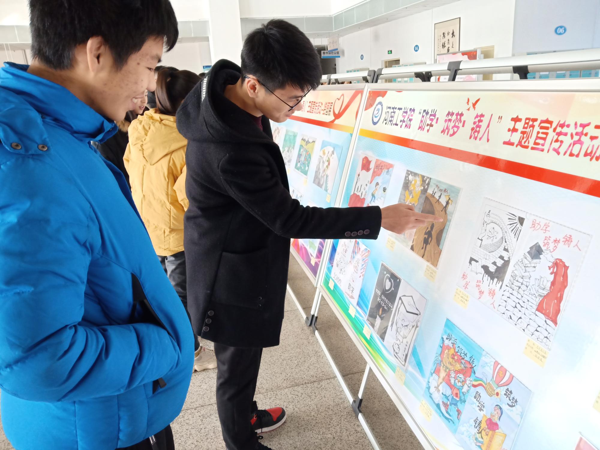 我校积极组织活动宣传,自活动正式启动以来,全校学生踊跃投稿,共收到学生作品156件,其中征文作品15件,音频9件,绘画作品132幅,经过专家老师评比,特在我校选出优秀作品41幅。并在我校举办“助学 筑梦 铸人”绘画展,吸引了我校广大学子到场观看,学生处副处长于善思老师并给予此次展览极大的肯定和支持。资助是国家给予青年的一次盛开的机会,让青年追逐青春的梦想,实现自身的价值。此次活动让广大青年学子了解来自于祖国的关怀,激励青年奋发向上,一展鸿鹄之志。