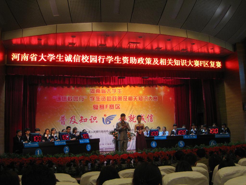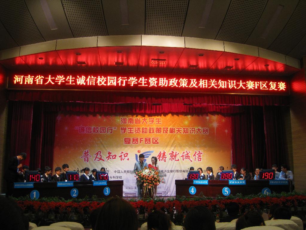 本次“诚信校园行”知识大赛的主题是“普及知识,铸就诚信”,由河南省教育厅、中国人民银行郑州市中心支行、国家开发银行河南省分行主办,复赛的F赛区由焦作师范高等专科学校承办。本赛区共有17个学校派出代表队参加比赛。