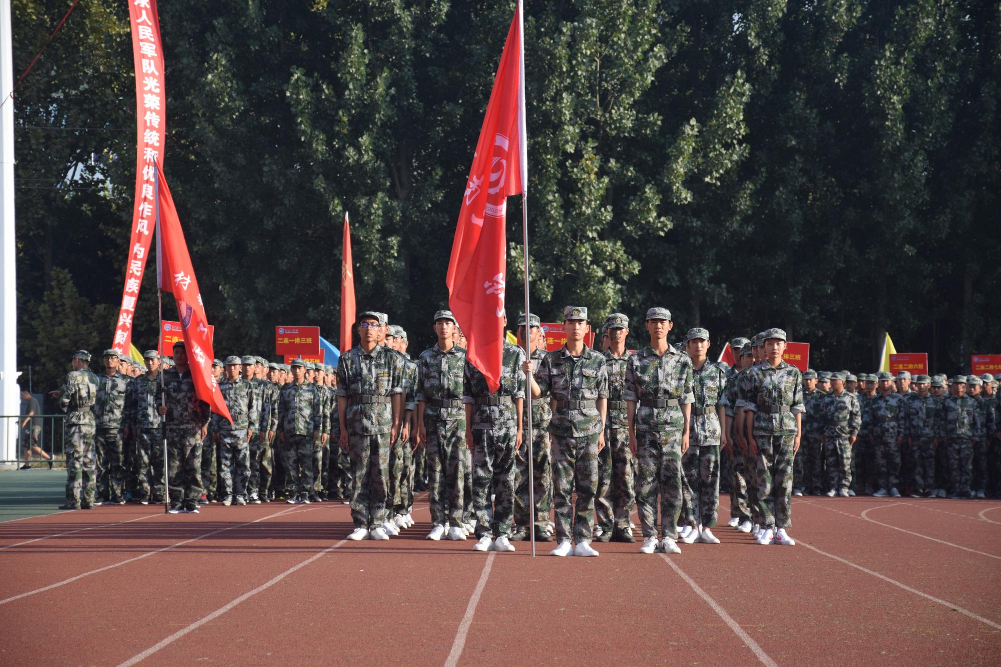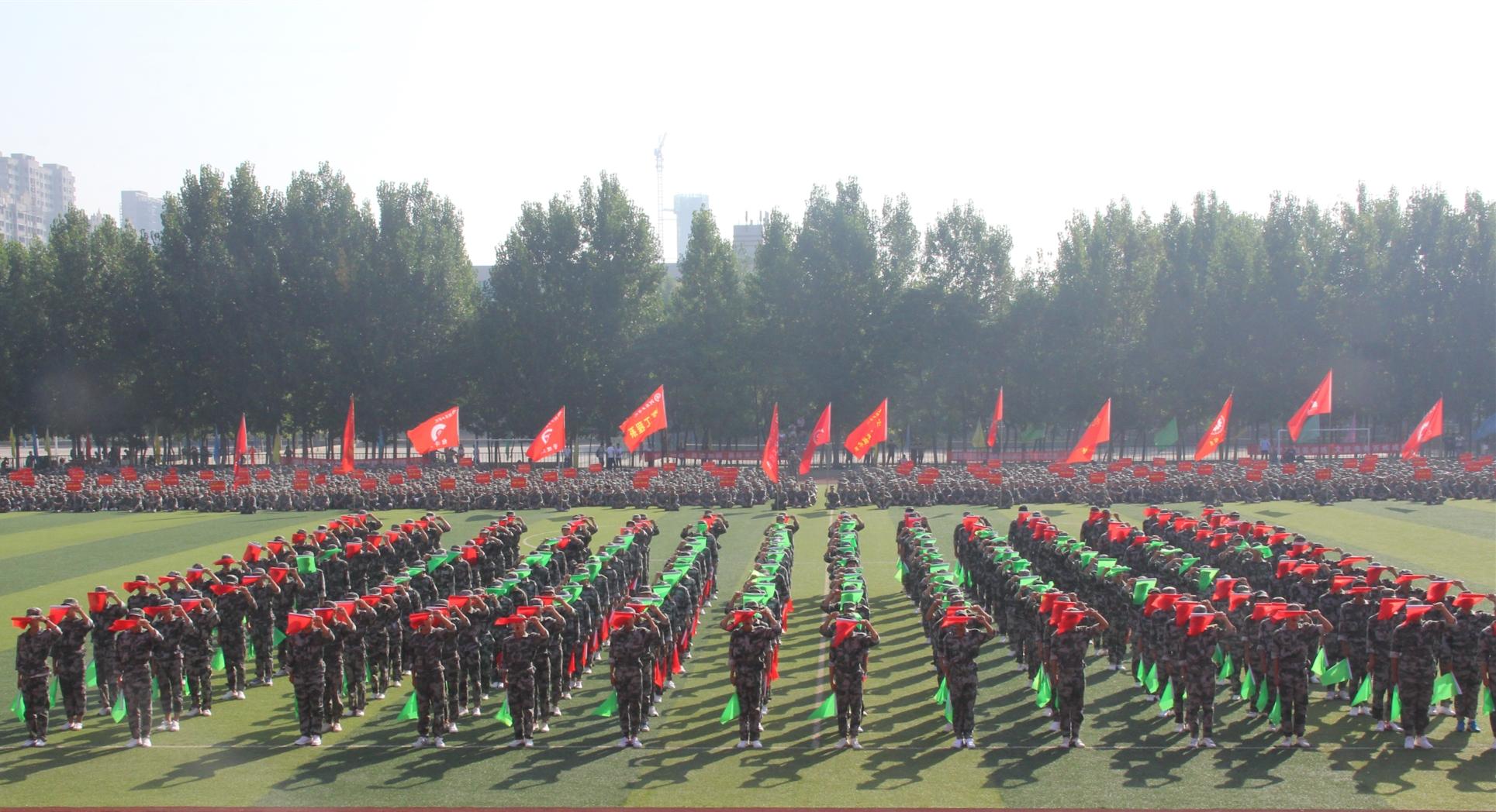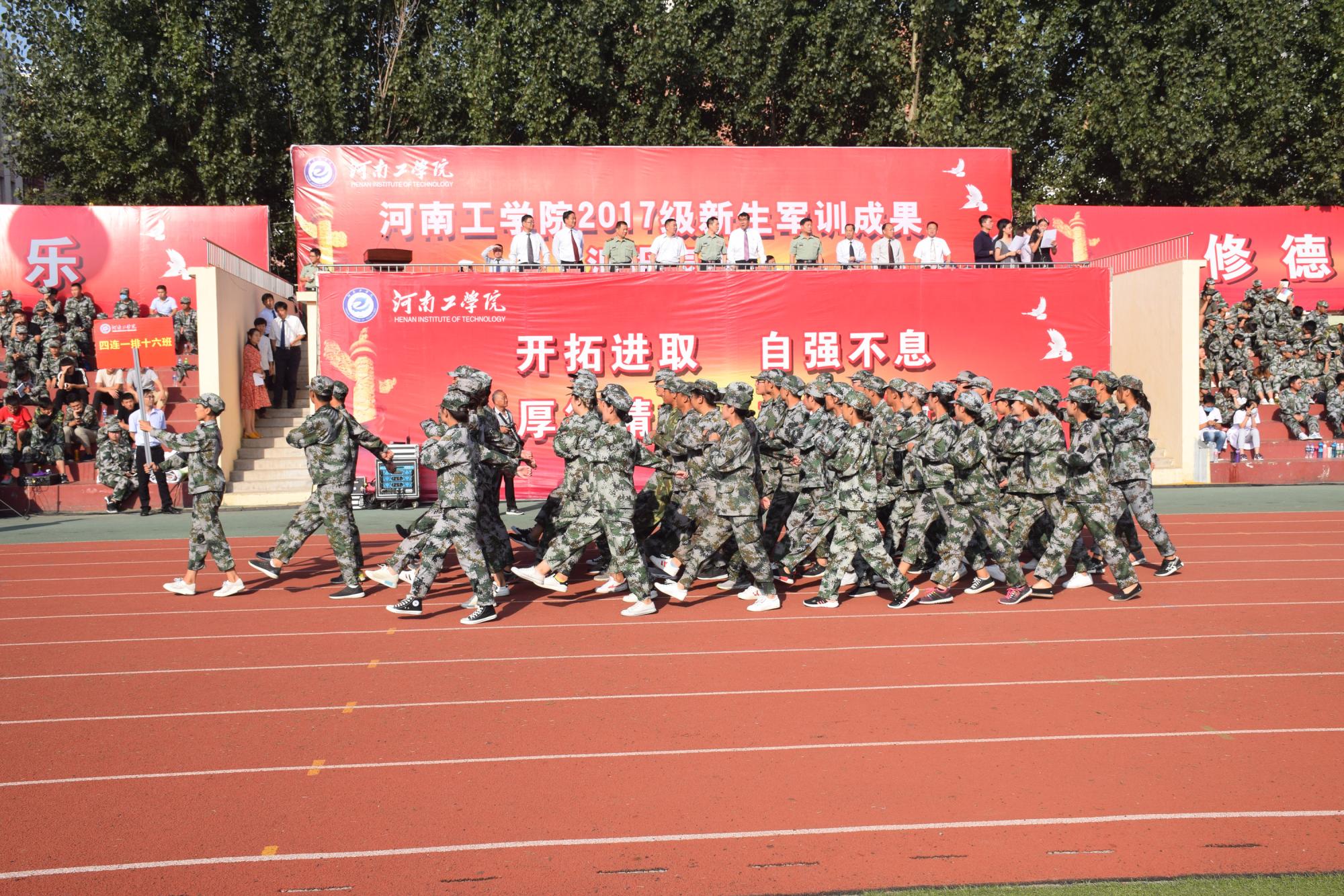 9月22日上午8点,我校2017级新生军训成果汇报表演在平原路校区田径场隆重举行。新乡军分区副司令员张键、省教育厅体卫艺处主任高根立、新乡军分区战备建设处处长王晓辉、红旗区人武部部长陈爱国,校领导、校长助理、相关职能部门负责同志、各系党总支书记出席了大会,2017级全体新生与部分教师、全体辅导员在观众席观看表演。大会由校领导贾积身主持。
