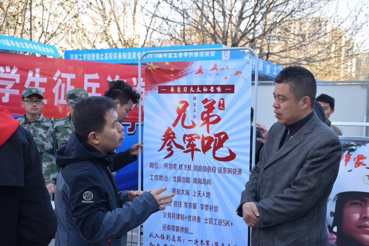 国富民强新时代,正是男儿报国时。为扎实做好大学生征兵工作,增强征兵宣传的针对性和有效性,提高毕业生参军积极性,3月23日上午,河南工学院武装部在学校毕业生春季供需洽谈会上设立咨询处,现场为青年学生提供咨询服务,通过面对面的宣传,宣讲大学生参军入伍优惠激励政策,解答广大青年学子参军入伍相关问题。活动现场,青年学生们兴致高昂地观看征兵宣传展板,领取了政策宣传手册,并现场向工作人员咨询应征报名的相关政策。