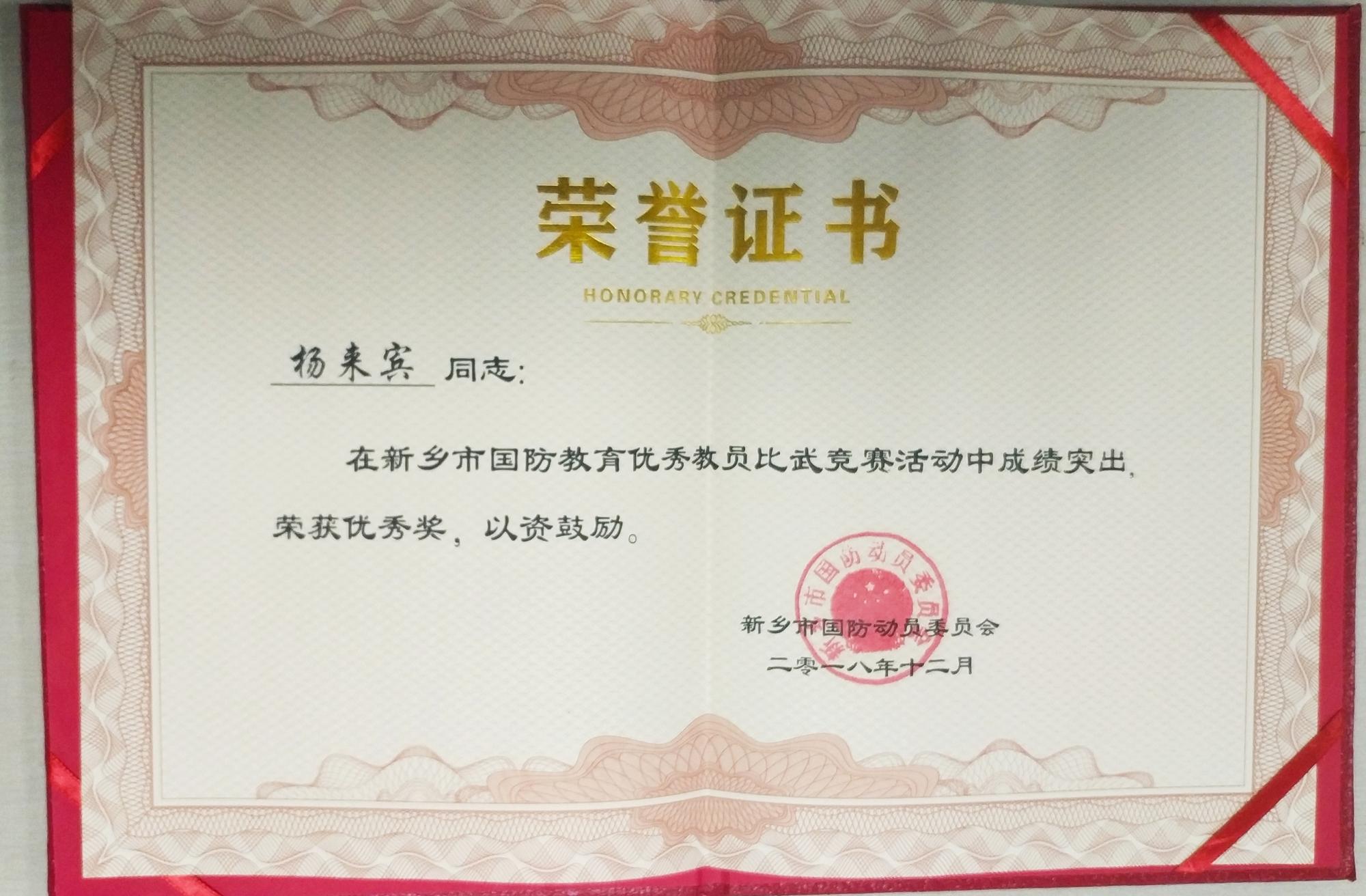 3月28日,红旗区党管武装工作会议在区武装部召开,会上对2018年度武装工作突出的单位和个人进行表彰。我校武装部荣获“先进基层武装部”荣誉称号,国防理论教研室杨来宾老师被新乡市国防动员委员会评为“国防教育优秀教员”。