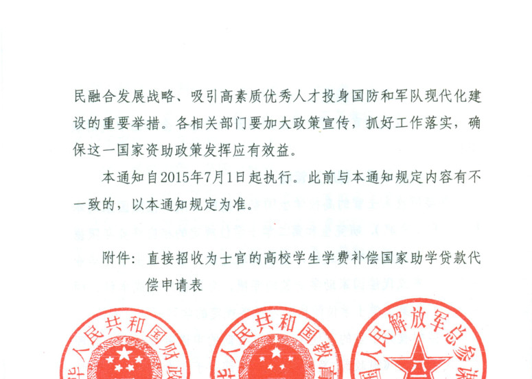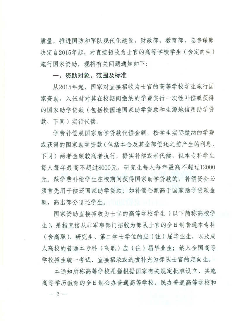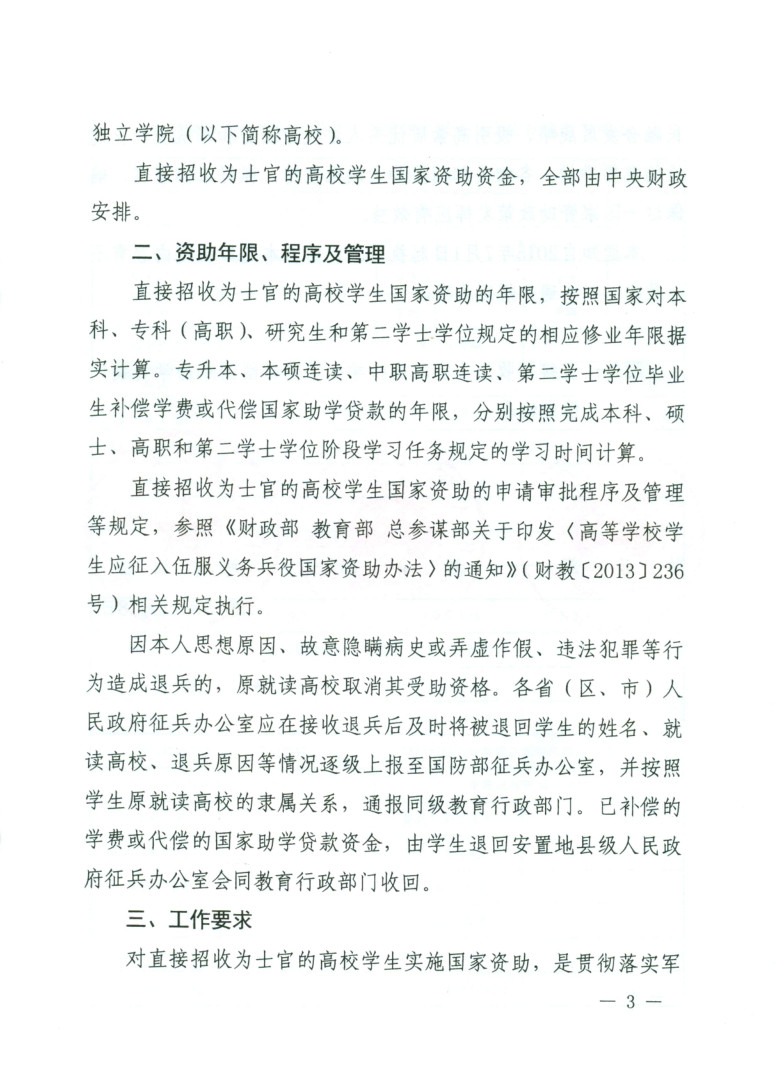 财政部 教育部 总参谋部关于对直接招收为士官的高等学校学生施行国家资助的通知