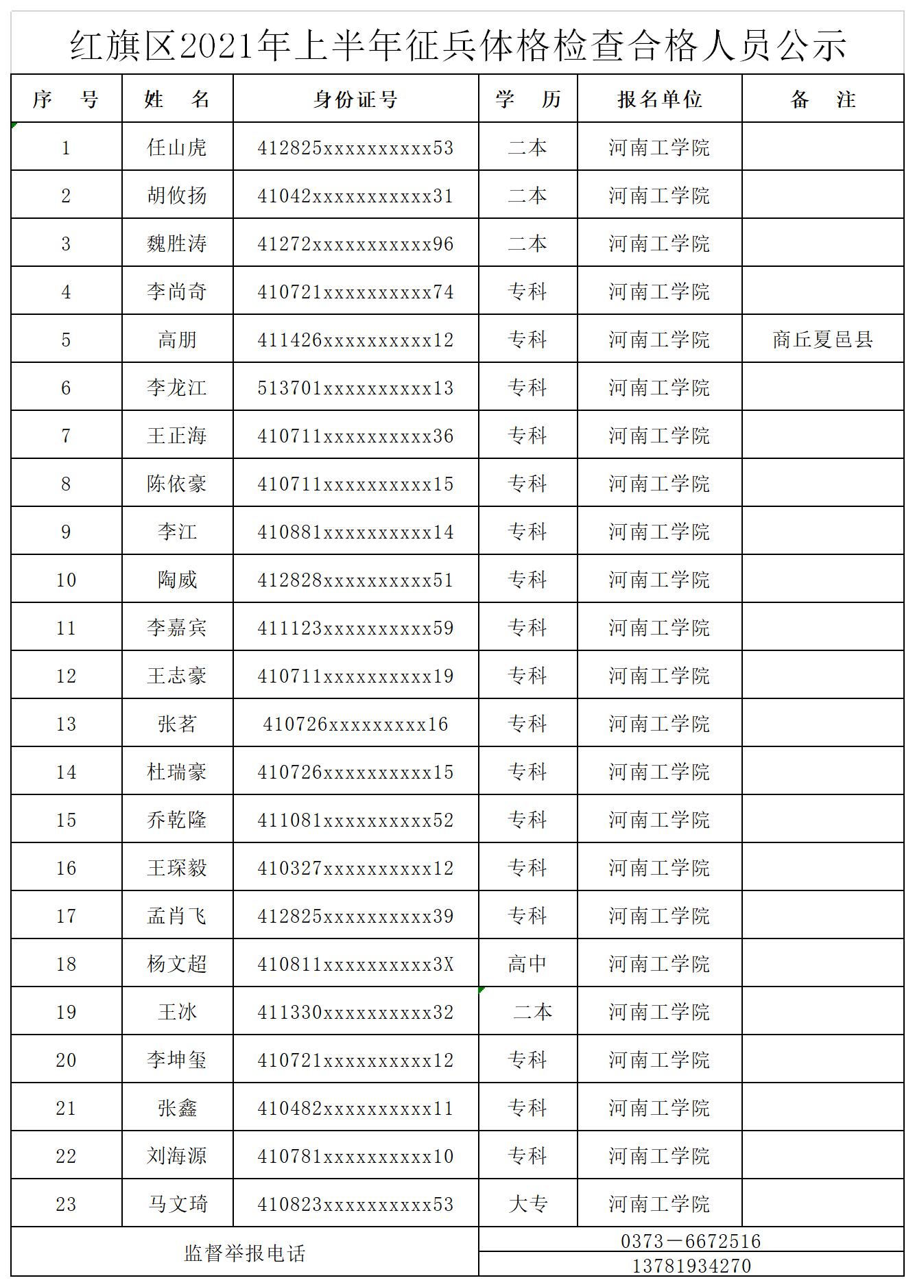 经过初审初检、上站体检、复检等流程,红旗区人武部确定我校2021年上半年体检合格人员23人,根据征兵工作要求,现将结果予以公示,请广大师生监督。